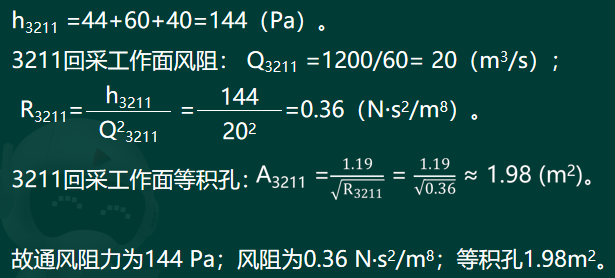 2.计算3211回采工作面(包括进风巷、作业面、回风巷)的通风阻力、风阻和等积孔(保留小数点后两位)