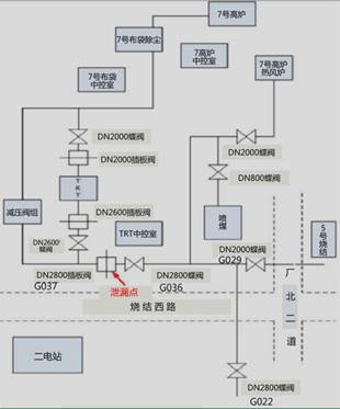 经事故调查组调查,熊某某、梁某某在未确认7号高炉煤气出口总管G036蝶阀关闭状态且未通知区域人员撤离的情况下,违反《煤气安全管理标准》、《岗位规程》等规定操作G037插板阀,且未按规定配戴空气呼吸器进行作业和监护,导致大量煤气泄漏是导致此次事故的直接原因。如图所示: