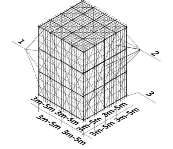 3) 当立杆纵、横间距为0.4m×0.4m~0.6m×0.6m(含0.4m×0.4m)时,在架体外侧周边及内部纵、横向每3m~3.2m应由底至顶设置连续竖向剪刀撑,剪刀撑宽度应为3m~3.2m。