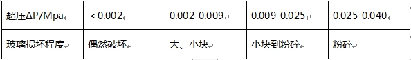 ;d为观测点到爆心的距离,m;W为药量.kg,冲击波超压导致玻璃破坏的准则见下表所示,若给定WTNT为8.0kg,d为10.0m处的玻璃门窗在炸药爆炸后,玻璃损坏程度为( )。