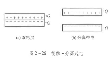 cm 时,由于不同物质束缚最外层电子的能力不同,将发生电子转移。因此,界面两侧处会出现大小相等、极性相反的两层电荷。这两层电荷称为双电层。其间的电位差称为接触电位差。当两种物体迅速分离时即可能产生静电。